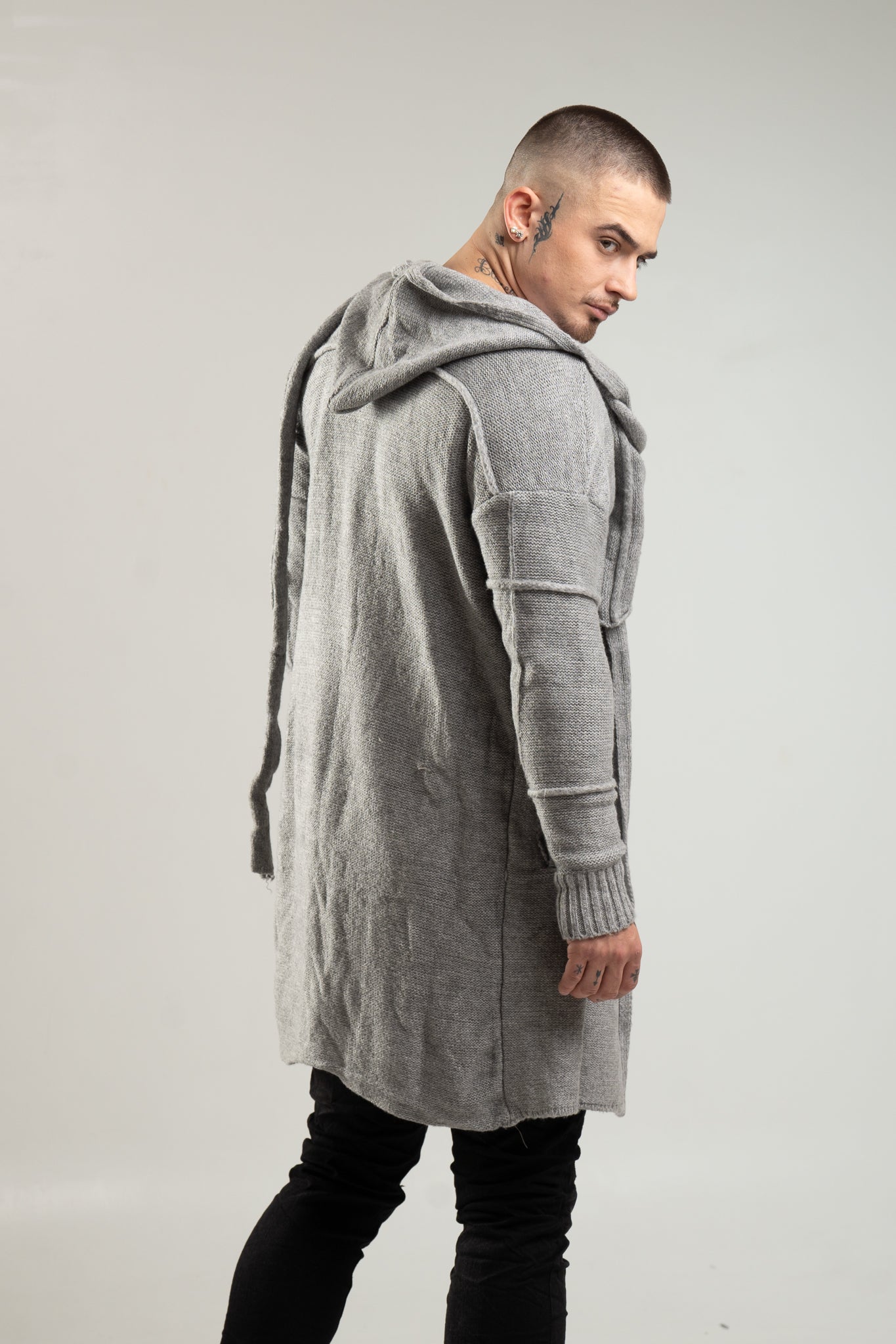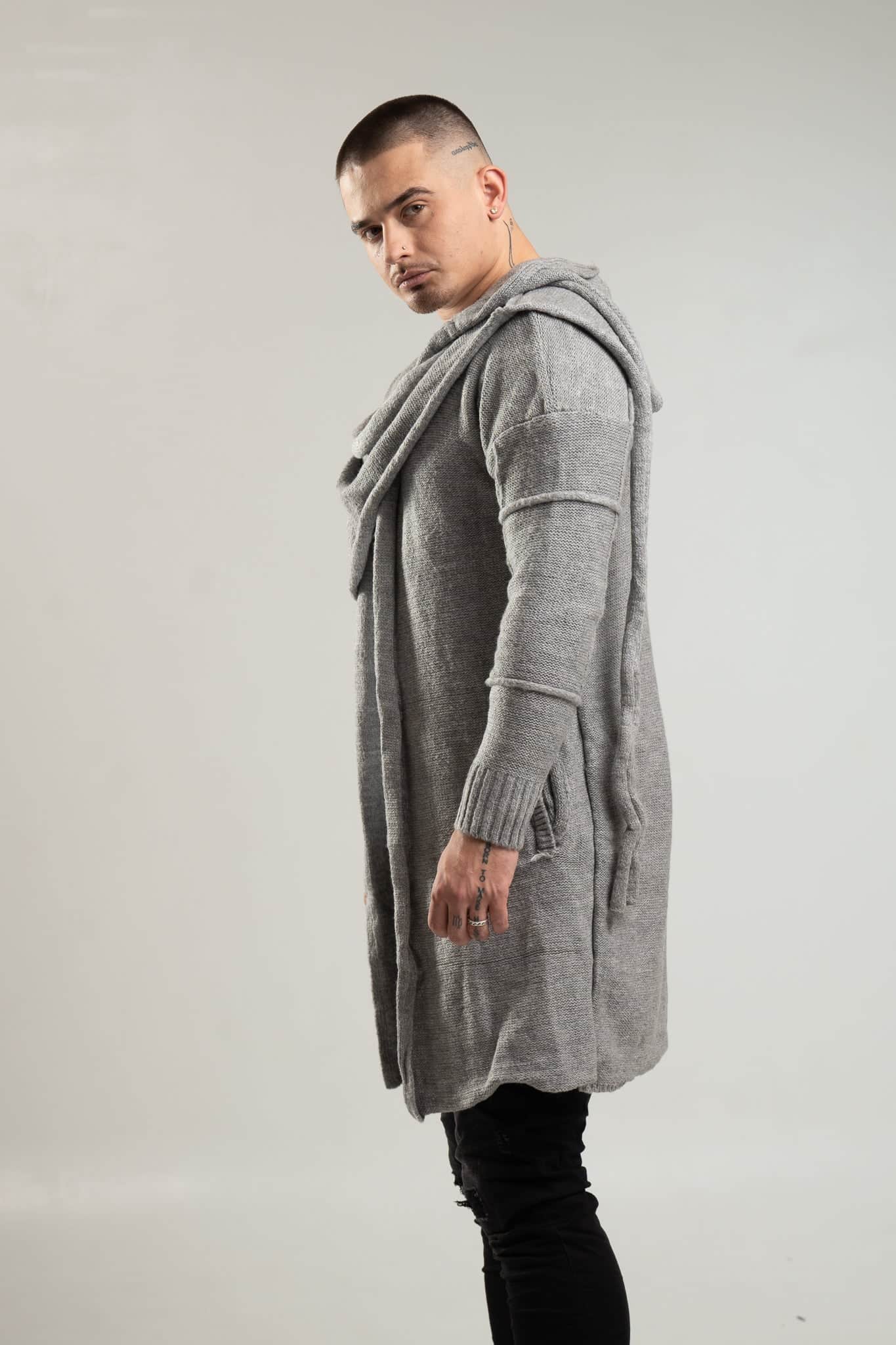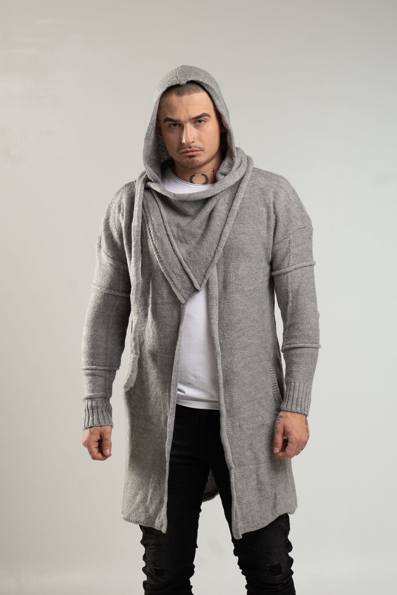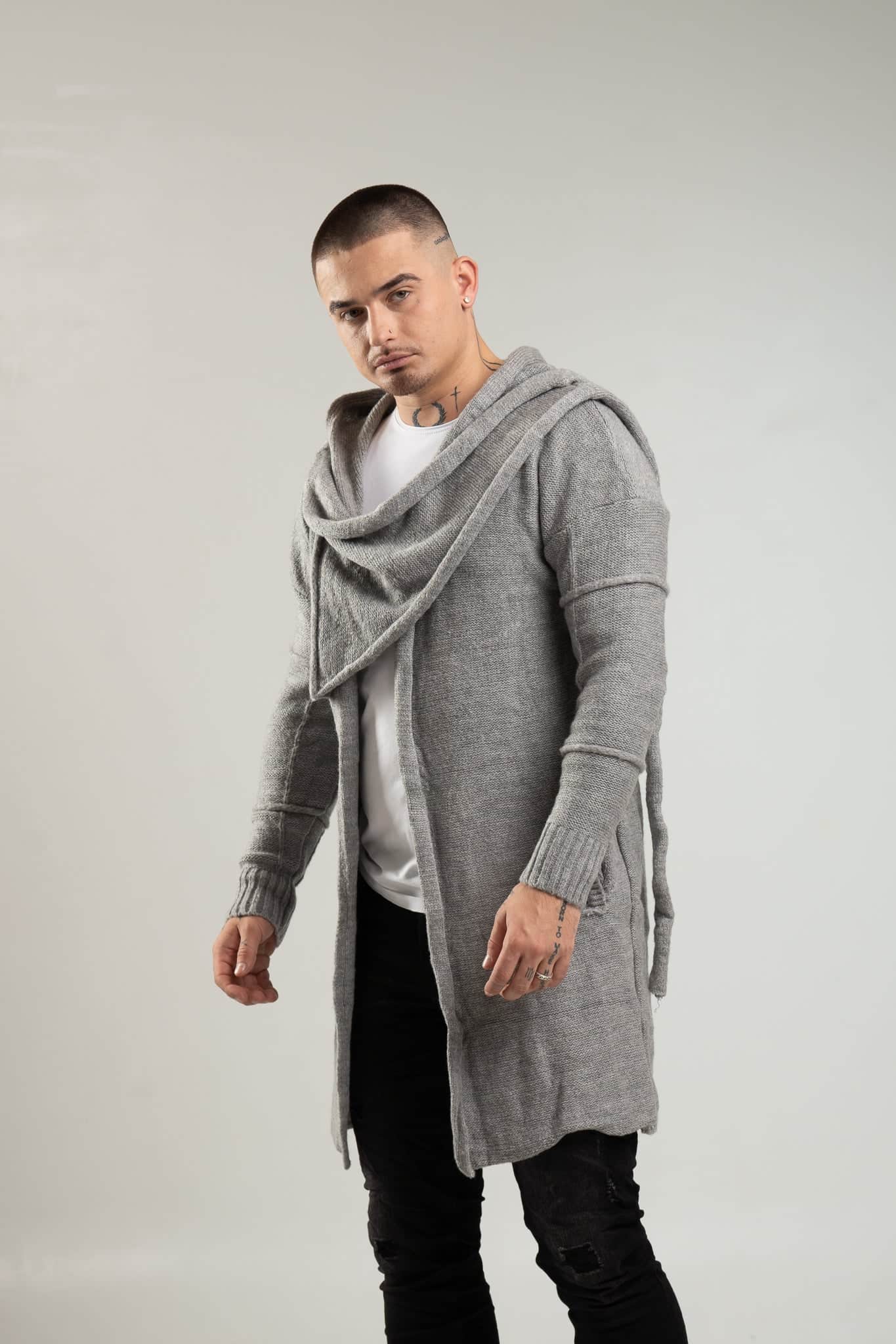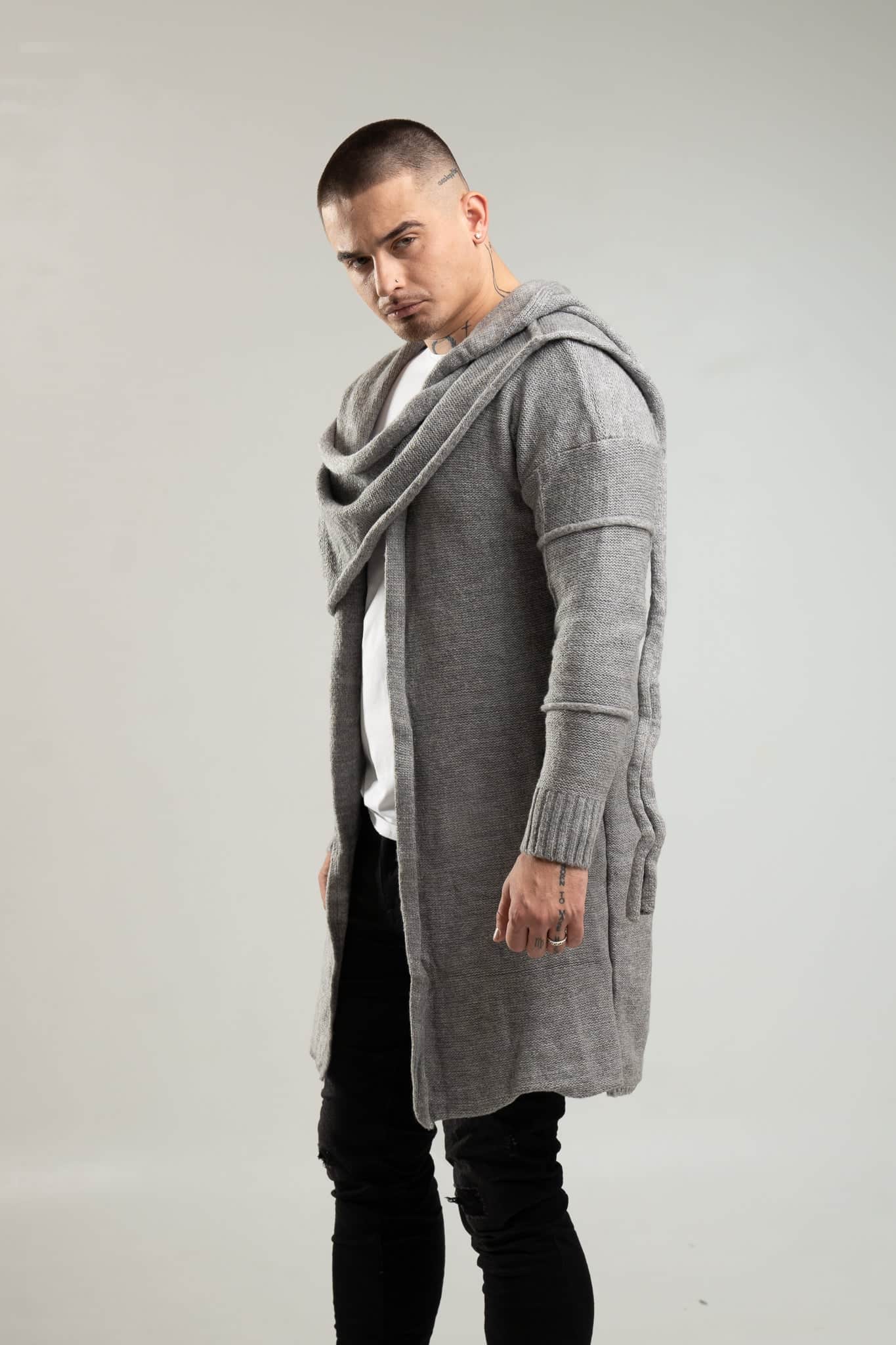 Szary kardigan męski o dłuższym kroju to model wykonany ze 100% akrylu. Kardigan nie jest zapinany. Posiada dwie kieszenie z przodu oraz duży kaptur. Rękawy zakończone są ściągaczem. Charakterystyczne elementy, które zwracają na siebie uwagę to przede wszystkim ozdobne przeszycia na całej powierzchni swetra oraz przedłużony element kaptura w postaci szala.