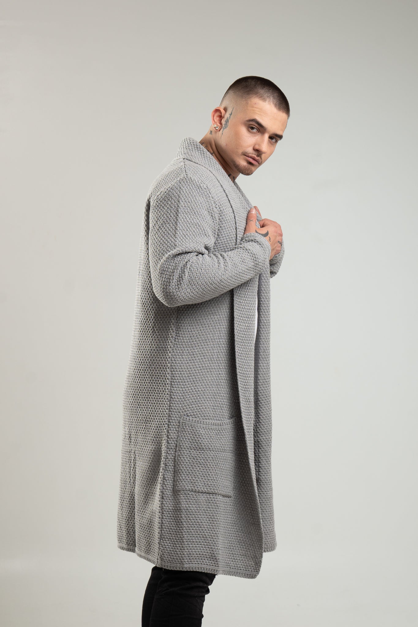 Stylowy, szary kardigan męski o dłuższym, dopasowanym kroju. Posiada dwie duże kieszenie z przodu. wykonany jest ze 100% akrylu. Oryginalnego charakteru dodaje mu ozdobny kołnierz, którego wzór rozciąga się na całej długości kardiganu.