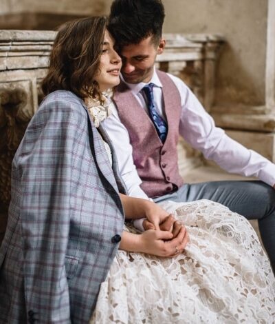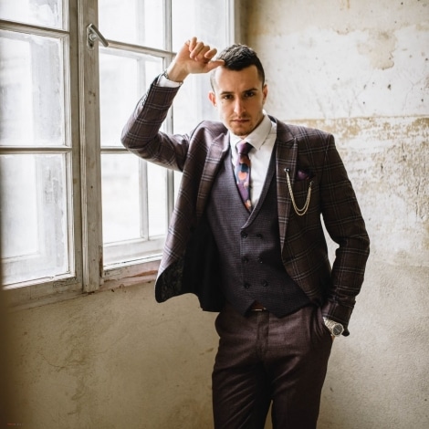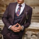 – garnitur typu slim-fit, trzyczęściowy (marynarka w granatową kratę, kamizelka w granatowy wzór, spodnie gładkie)