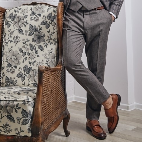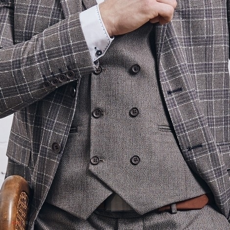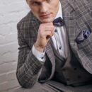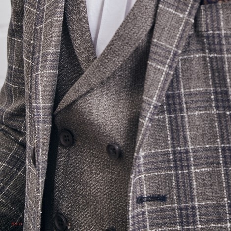 – garnitur typu slim-fit, trzyczęściowy (marynarka w kratę glencheck, kamizelka oraz spodnie gładkie w kolorze szaro – brązowym)