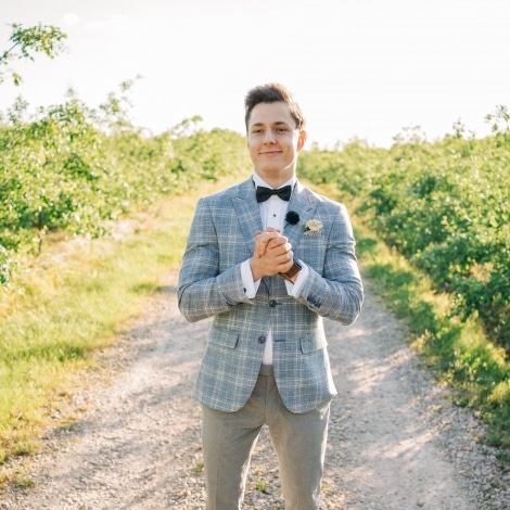 – garnitur typu slim-fit, trzyczęściowy (jednorzędowa marynarka w kratę, gładka kamizelka w odcieniach szarości, błękitne spodnie)