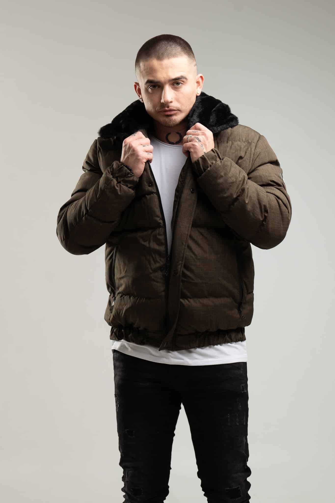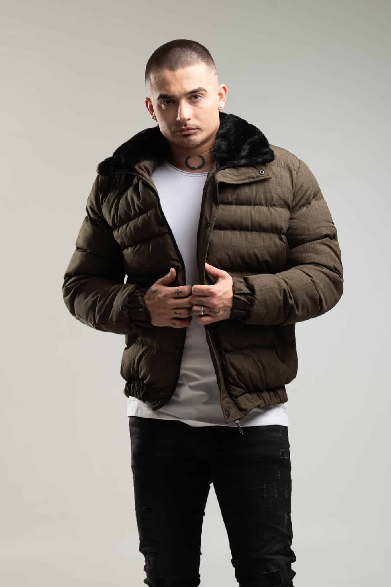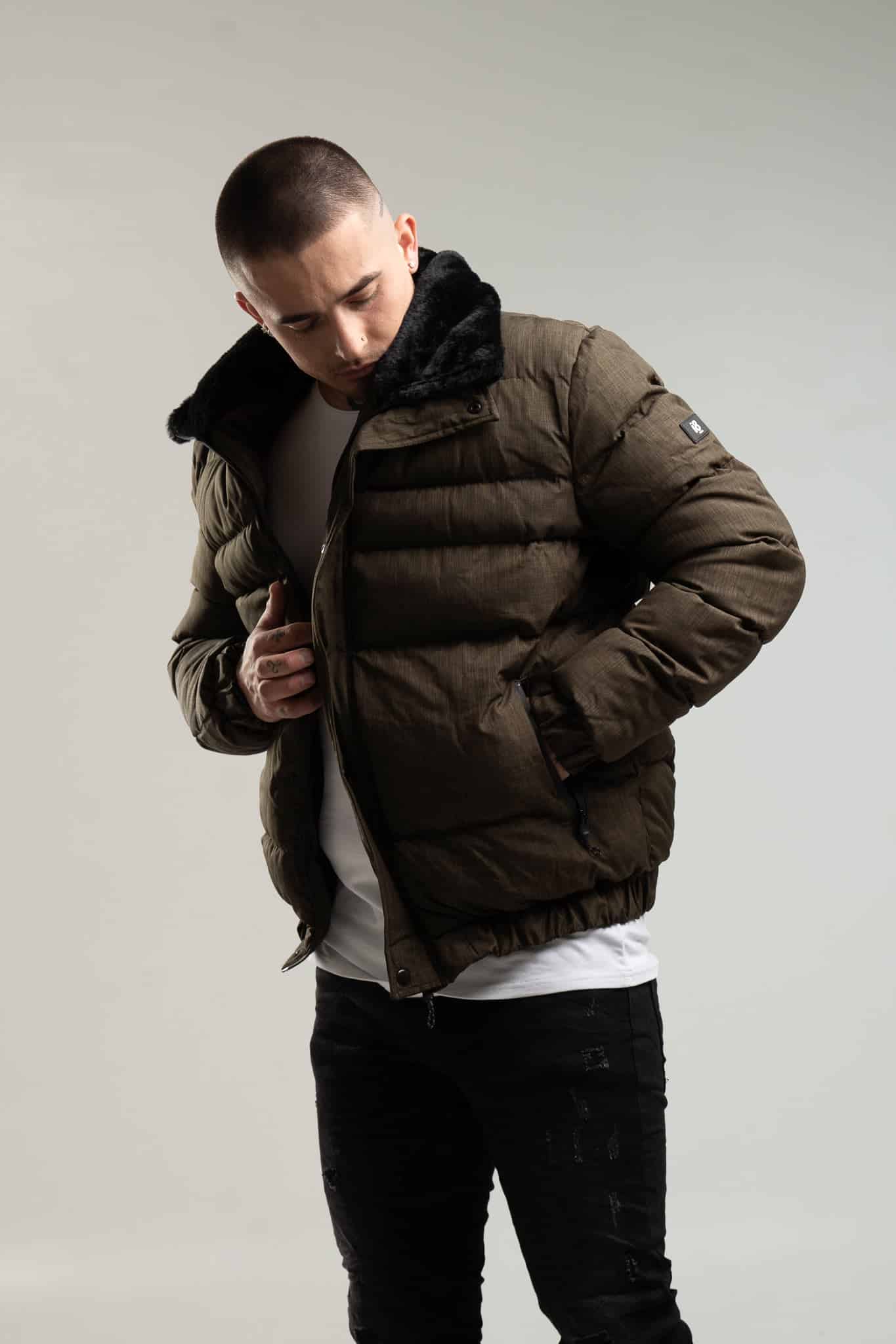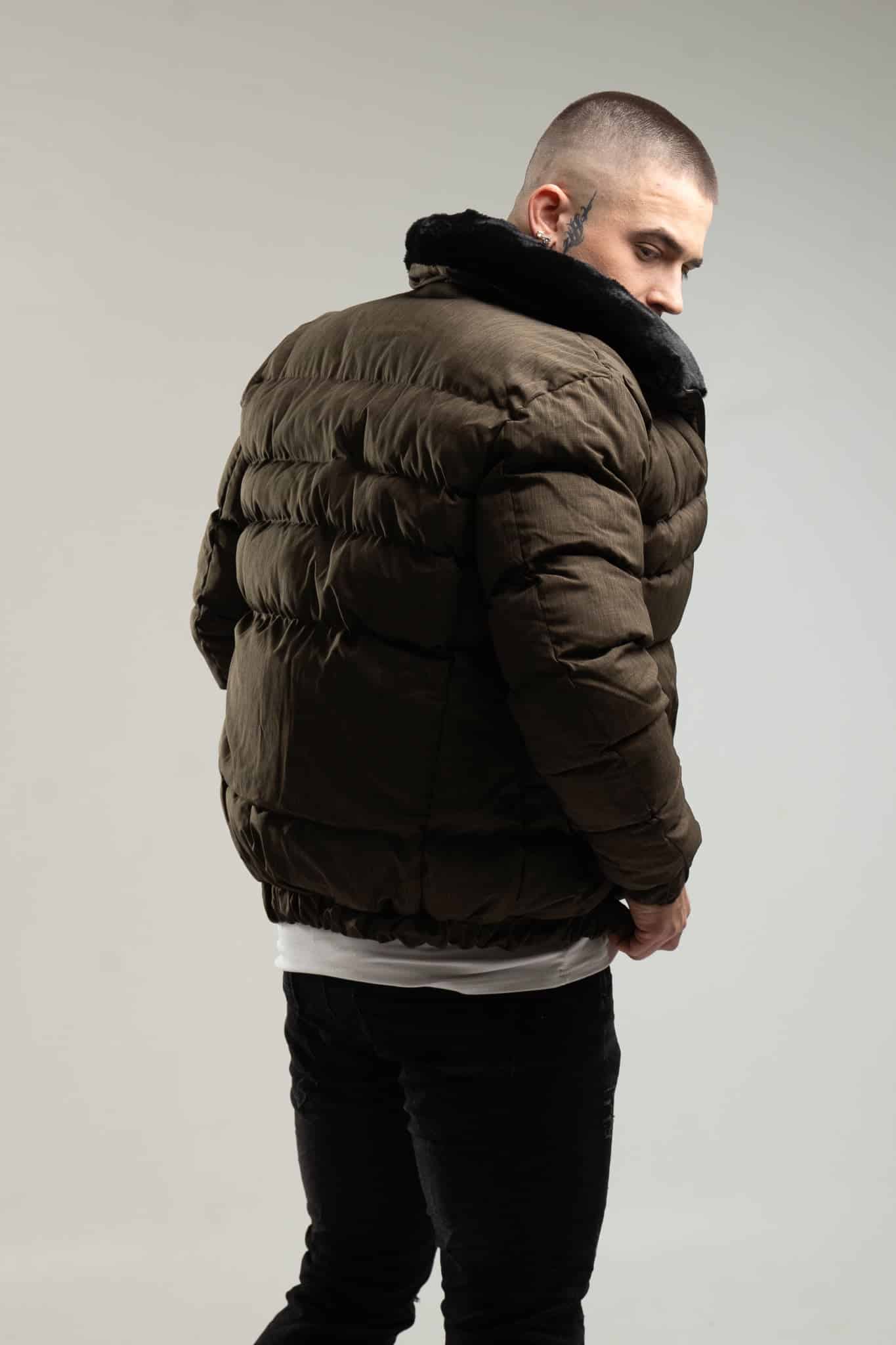 Stylowa kurtka męska o kroju slim-fit w kolorze zielonym. Krótka, odporna na zagniecenia oraz łatwa w pielęgnacji. Wykonana ze 100% poliestru. Posiada dwie boczne kieszenie zapinane na zamek. Wewnątrz znajduje się jedna kieszeń piersiowa. Kurtka zapinana na zamek, który zasłania listwa w kolorze khaki z napami. Nie ma kaptura, kołnierz typu stójka z ozdobnym, ciepłym „misiem”. Rękawy oraz dół kurtki zakończone są ściągaczem.
