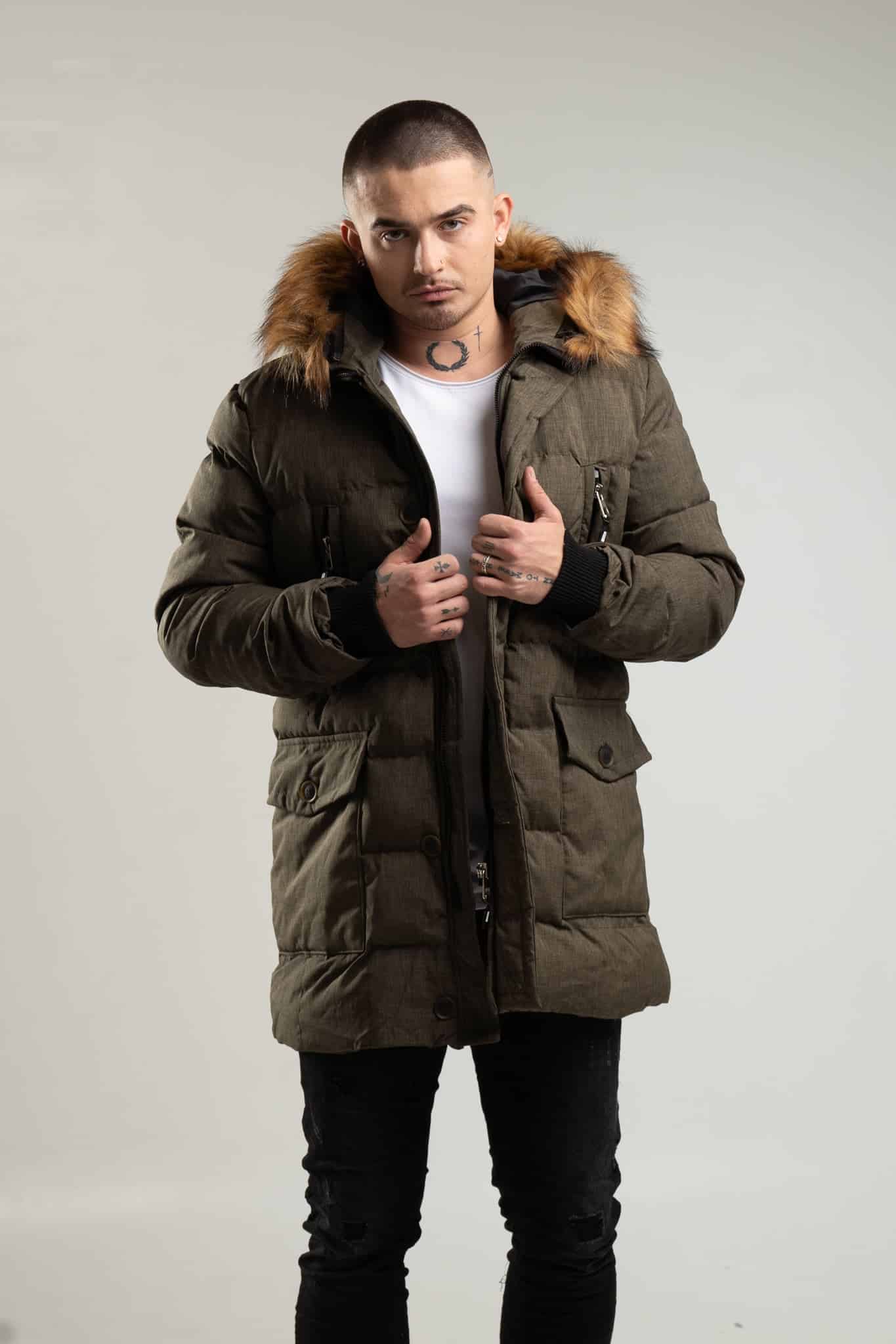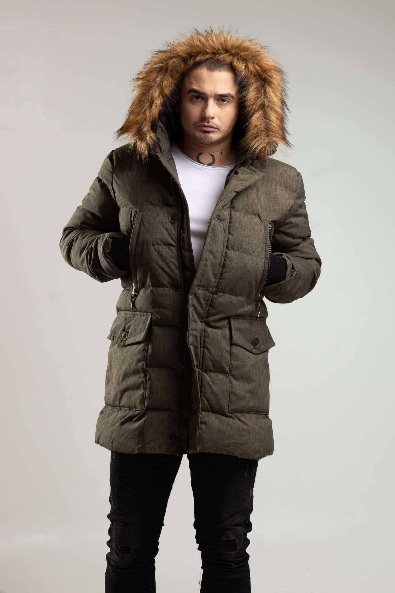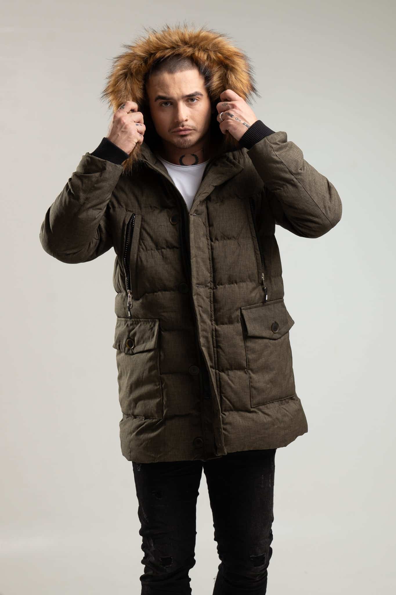 Kurtka męska w kolorze khaki to lekka, odporna na zagniecenia oraz łatwa w pielęgnacji propozycja na ten sezon. Wykonana ze 100% poliestru. Posiada cztery kieszenie zewnętrzne – dwie duże zapinane na guziki oraz dwie piersiowe zapinane pod skosem na zamek. Wewnątrz znajduje się jedna kieszeń piersiowa. Kurtka zapinana na zamek oraz na guziki. Ma kaptur z ozdobnym futerkiem, które w każdej chwili można odpiąć. Rękawy zakończone ściągaczem ze specjalnym wycięciem na kciuka.