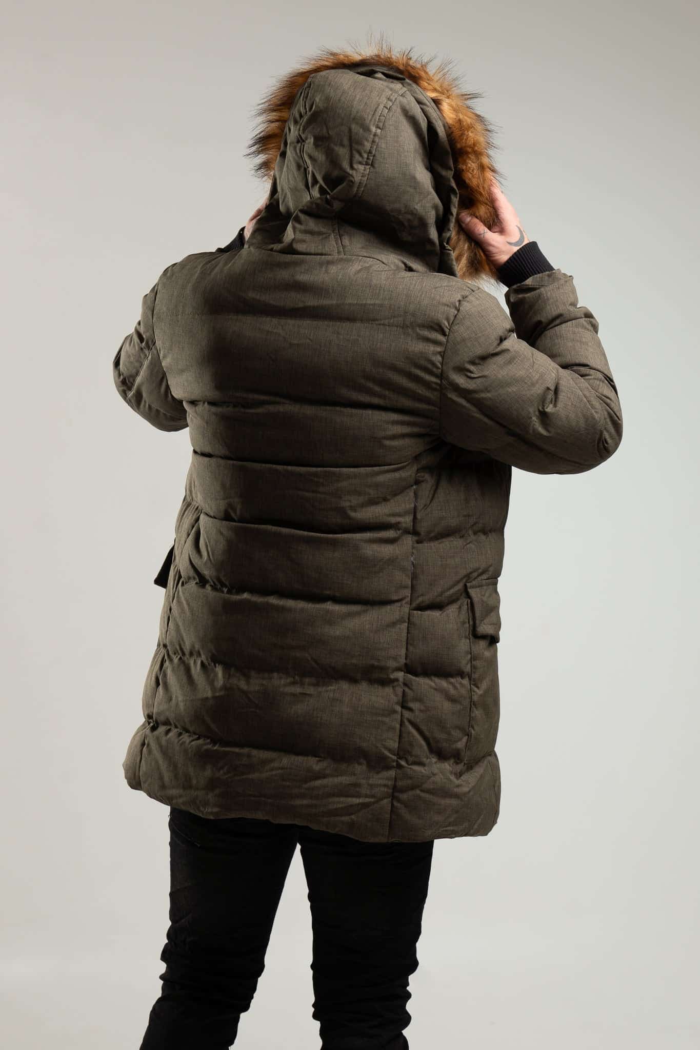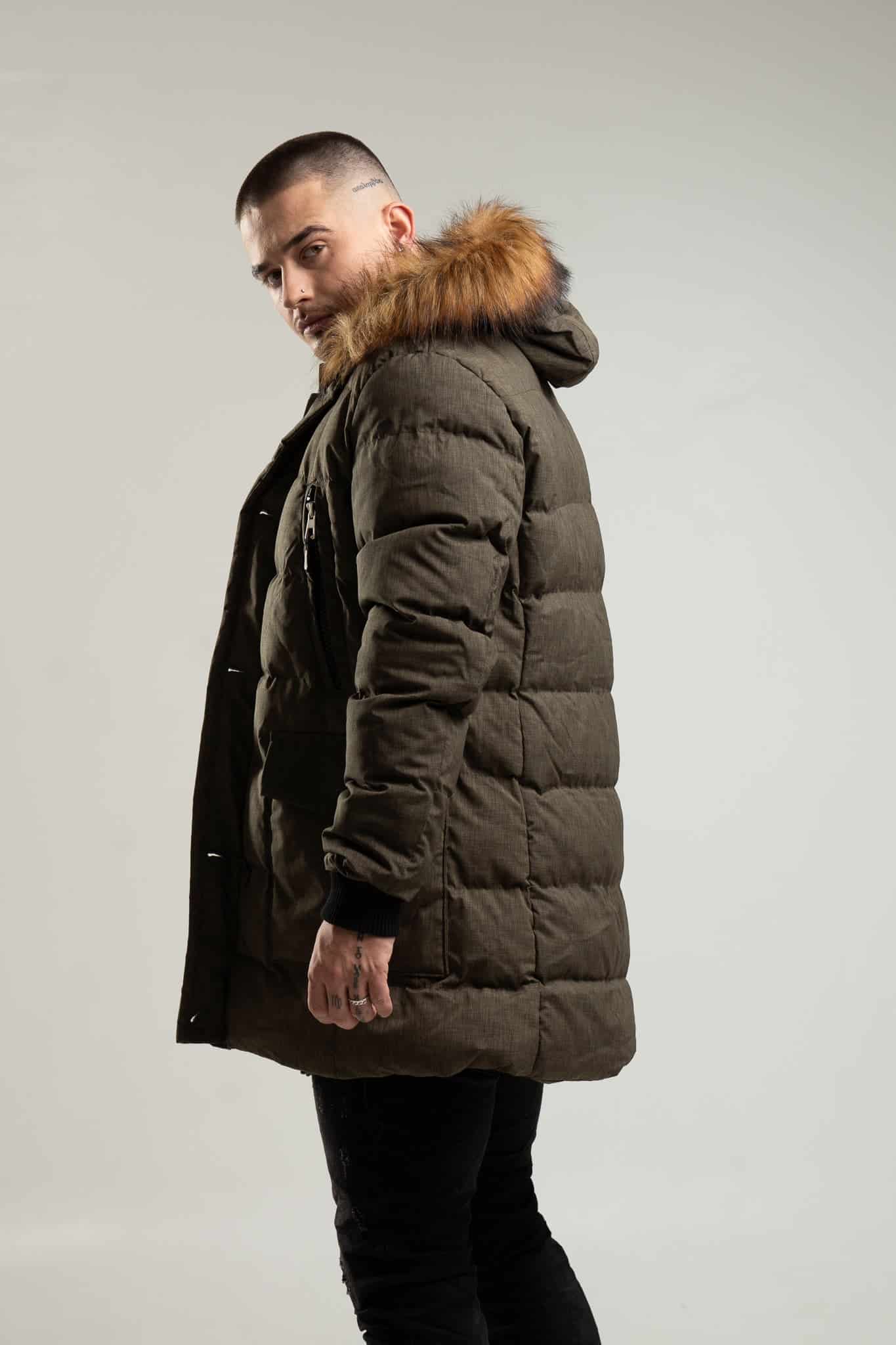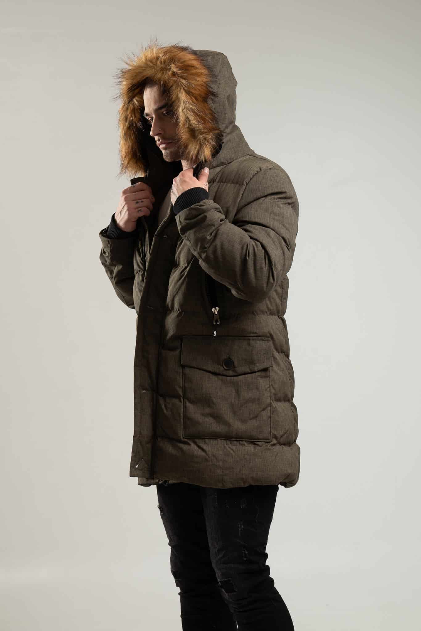 Kurtka męska w kolorze khaki to lekka, odporna na zagniecenia oraz łatwa w pielęgnacji propozycja na ten sezon. Wykonana ze 100% poliestru. Posiada cztery kieszenie zewnętrzne – dwie duże zapinane na guziki oraz dwie piersiowe zapinane pod skosem na zamek. Wewnątrz znajduje się jedna kieszeń piersiowa. Kurtka zapinana na zamek oraz na guziki. Ma kaptur z ozdobnym futerkiem, które w każdej chwili można odpiąć. Rękawy zakończone ściągaczem ze specjalnym wycięciem na kciuka.